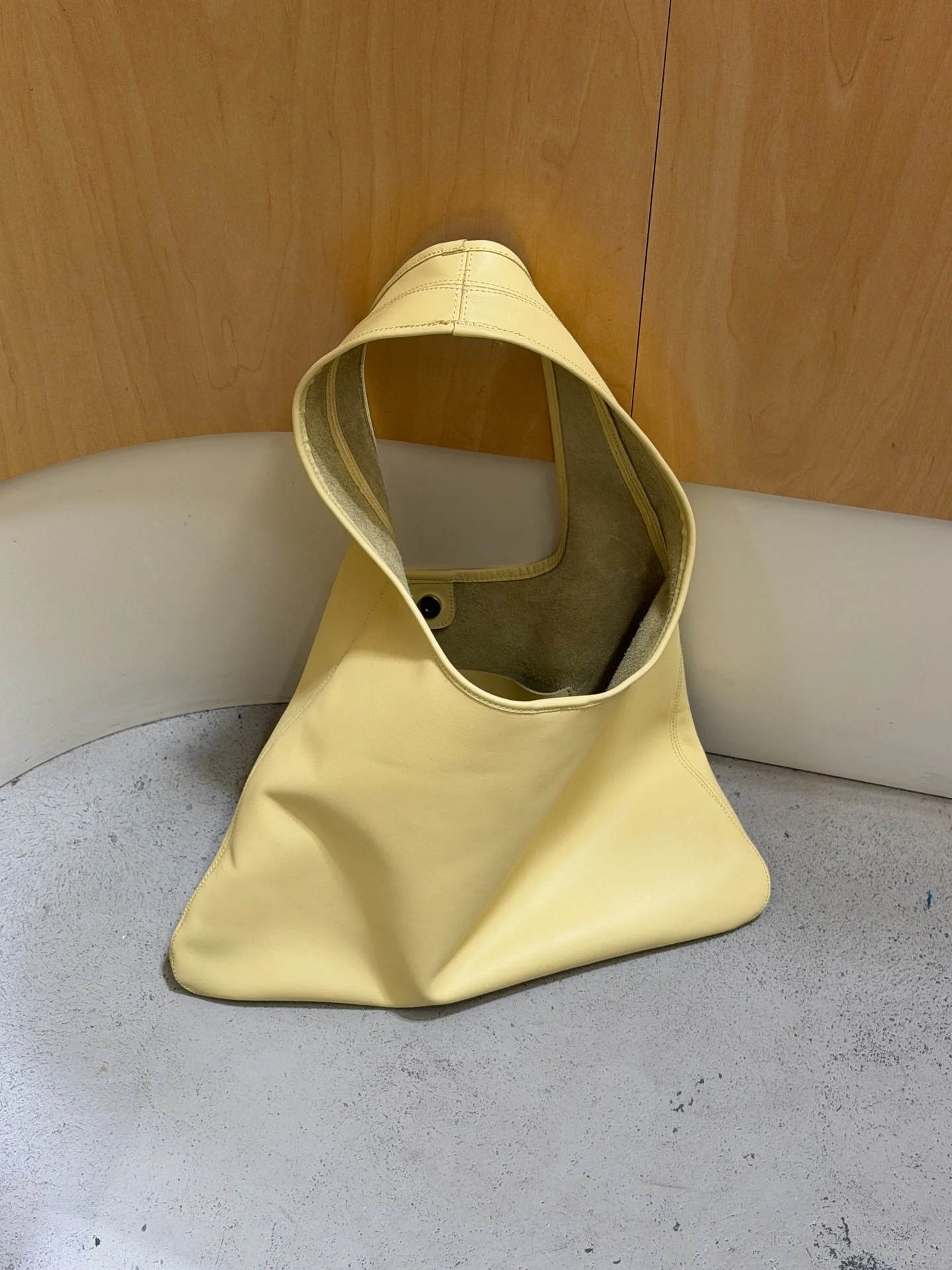 A banana hued leather tote with an interior pouch and magnetic fastening.